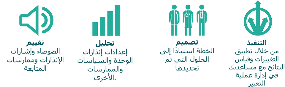 قد يكون لأي إنذار فائت أو تم كتمه أو لم يتم الرد عليه، عواقب مميتة على المرضى. ويشكّل هذا الموقف سمة من سمات مشكلة متعددة الأوجه يجب أن تتضمن نظرة عن الأشخاص والعمليات والتكنولوجيا وثقافة مؤسستك. وهنا يكمن دورنا في المساعدة على إجراء مراجعة ووضع حلول وبلورة خطة تنفيذ.
