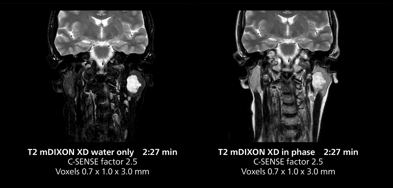 This MRI case illustrates imaging of salivary gland abnormalities with different sequences. Compressed SENSE allows to accelerate scanning while maintaining high quality. With mDIXON XD, different contrast types can be obtained from scanning one sequence.