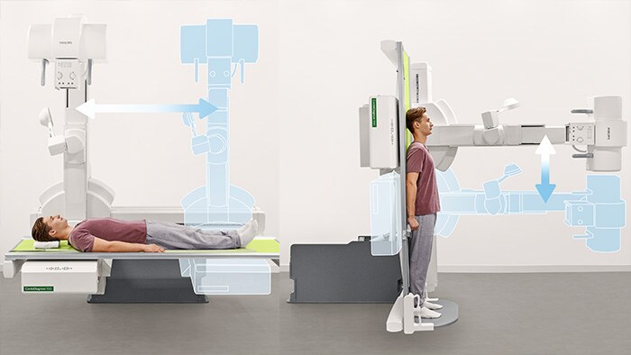 • Automatic Image Stitching on the table in upright and lying position with body coverage of up to 150 cm (59")